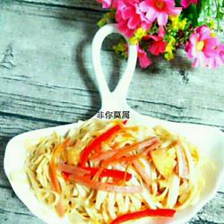 4. Pour oil into the pot, heat up, add 2-6 ingredients, stir-fry for a while, pour Add noodles and stir-fry for 1 minute.Add light soy sauce! Oyster sauce, balsamic vinegar, salt.Chicken Essence.Finally, add the fried and shredded eggs and stir-fry evenly.Drizzle with sesame oil! Turn off the heat.