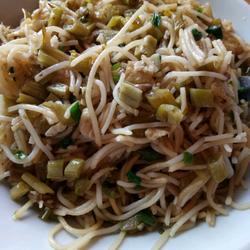 5.Put oil in a hot pan (the oil you need for fried noodles will stick to the pan, but not too much, which will make you greasy), put the chili and pickled beans , put eggs and green onions into the pot, add some soy sauce and stir-fry, turn off the heat, add noodles, and stir-fry