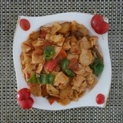 14. Put the ingredients in the pot and stir-fry until cooked, add tomato sauce, and finally add green peppers, green onions, and shiitake mushrooms.Stir fry a few times and add the dough.