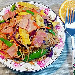 1.The noodles are cooked.Cut bacon into small slices, shred onions, carrots, and green peppers, and beat an egg in a bowl and set aside.