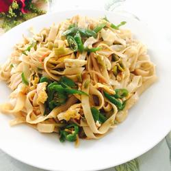 4.Add the cooked wide noodles, add an appropriate amount of light soy sauce to add color and flavor, stir-fry evenly, add a spoonful of vinegar before serving, and stir well