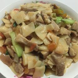 9. Burning While the water is cooking the noodles, heat the oil in a wok, stir-fry the meat first, then add the shiitake mushrooms, king oyster mushrooms and tomatoes, finally add the Shanghai greens, add salt and light soy sauce