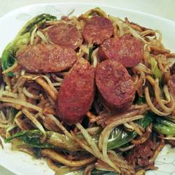6. Pour in the noodles and add some dark soy sauce and stir-fry