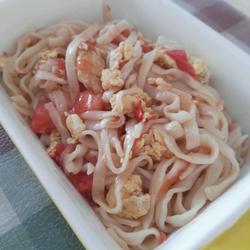 4. Boil the noodles, pour them into cold water, pour them into the pot with eggs and tomatoes and stir-fry together, add A little salt, seafood soy sauce, and take it out of the pan.