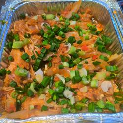 4.Pour the cooked enoki mushrooms into the tin foil box, sprinkle with green onions for decoration, and serve