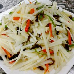2.Cut green and red peppers into shreds, blanch fungus, cool and shred