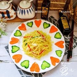 Blanch the shredded potatoes before frying them.Shredded potatoes are refreshing