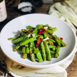 7.Add green beans and dried red pepper, stir-fry evenly
