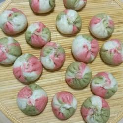 10.Take a small piece of dough and knead it into red yeast rice and matcha powder, then take a piece of white flour and knead it to deflate the air.After there are no big bubbles in the dough, knead it into long strips, stick them together, and cut them into three-color dumplings of equal size.I only made part of the three-color dumplings, and the rest were made white.Dosage.