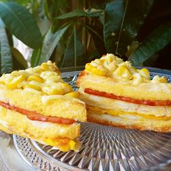 9.Cover with the last layer of bread slices, brush with egg wash, and sprinkle with some corn kernels