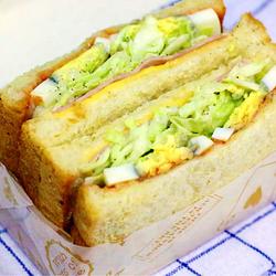 Ham slices ( 1 slice ) | Boiled eggs ( 1 ) | Cabbage ( 2-3 slices ) | Salad dressing ( appropriate amount ) |