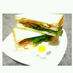7.Cover with another layer of toast slices, then add ham and green vegetables, and then cover with another layer of toast slices.Then slice it and you can eat