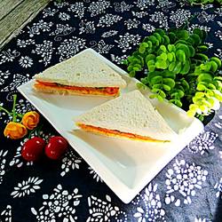 6. Spread a piece of toast with salad dressing, cover it on the top, and use four sticks Secure with toothpicks and split into two.A delicious sandwich is ready to enjoy.