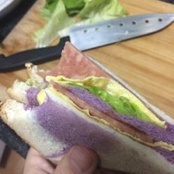 3. Put a square bun on the bottom, put eggs, ham, lettuce, squeeze on the salad dressing, you can spread the salad dressing Even, I'm lazy
