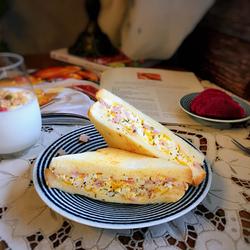 5.Take a piece of toast, spread a thick layer of chopped eggs and ham, and cover it with another piece of toast