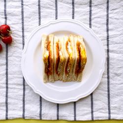 2. Two pieces of toast are spread with homemade peanut butter (one side is spread), and one piece of toast is covered with meat floss.