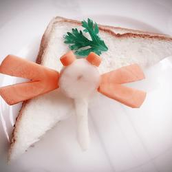 9.Stack three pieces of toast together, insert a toothpick diagonally into the sandwich and insert a dragonfly