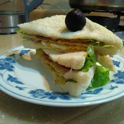 6.After the meat and ham are fried, put them on the second piece of bread, and then put another one For lettuce, spread the third piece of bread evenly with Thousand Island dressing, align it with the bread below, and spread it on top!