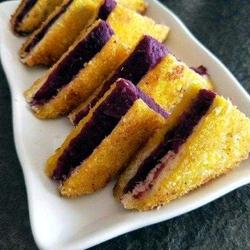 5.Put the toast on the chopping board and cut off the edges.Take a piece of toast and spread it evenly with purple sweet potato puree.Cover it with another piece (two in a group).Dip the toast evenly with the egg liquid, covering each side.~Cover with a layer of breadcrumbs (optional)
