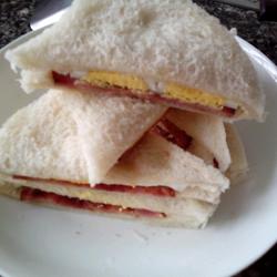 5.Take a piece of toast and apply a layer of salad dressing, then put a piece of bacon and apply a layer of salad dressing
