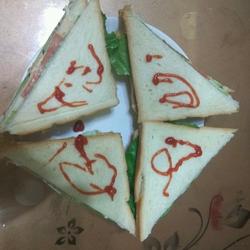 5. Smooth the peanut butter, add the egg skin and cucumber slices, and then add the bread with condensed milk.Place a piece of ham slices and lettuce, and cut the bread slices sandwiched with food into triangles.Squeeze an appropriate amount of tomato sauce on top.A quick and easy sandwich is ready.