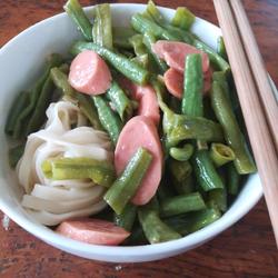 1.Wash the beans.Cut; ham sausage, slice (only one picture can be shown, and the picture of ham sausage will not be shown)