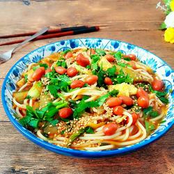 15.Add chopped green onion, eggs, chili oil (optional), peanuts and sesame seeds