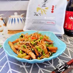 6.Add dried tofu, green and red pepper, and garlic slices and stir-fry evenly