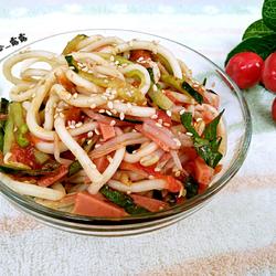 6.Pour the noodles, mung bean sprouts, cucumber, ham sausage and coriander into a large bowl