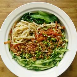 5. Take the noodles out of the cold water , put it in a container of suitable size, then add the prepared cucumber shreds, carrot shreds, and chopped green onions, then pour the prepared juice, stir evenly, and it is ready to eat.