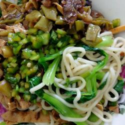 Noodles, beans, braised pork cubes, tofu skin, green pepper, coriander ( ) | Oil, olive oil, salt, sugar, soy sauce, chicken essence, pepper noodles ( ) |