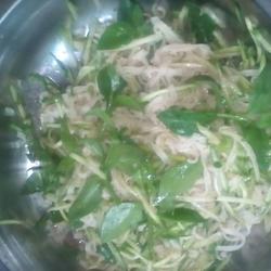 2. Cut the peppers and cucumbers into shreds, mince the garlic sprouts and put them into the rice bowl with the shredded noodles and vegetables
