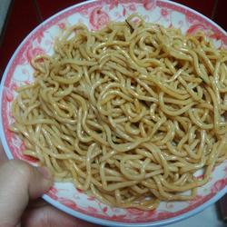 3.Put light soy sauce into scallion oil, consume oil, and stir-fry white sugar for half a minute, then add to noodles and mix well