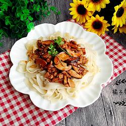 12.Noodles are sandwiched on a plate, topped with pork and mushroom sauce, ready to eat
