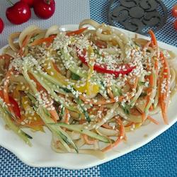 8.Put cucumber shreds, carrot shreds, red Add shredded pepper and yellow pepper to the noodles.
