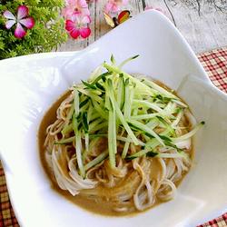 1.Cut cucumber into shreds, add sesame paste, salt, rice vinegar, light soy sauce and some water to make sesame sauce