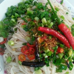 4. Remove the noodles from the water, put them on a plate, pour a little sesame oil and mix them in advance to prevent adhesion.Add chopped green onion and chili, sprinkle with a little salt, chicken essence, MSG, and drizzle Serve with light soy sauce.If you like spicy food, add chili powder