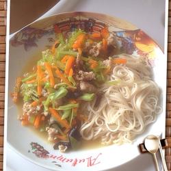 4. Heat oil in a dry pan, add all the vegetables and minced meat, and stir-fry.Add salt, soy sauce and cooking wine.Pour in a little water and fry until cooked.Add seasonings, mix well and put into the noodle bowl.Mix well and eat!