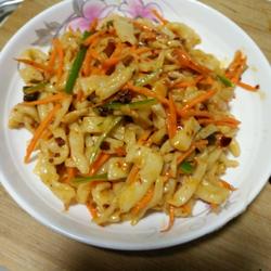 5. Add shredded onion, carrot shreds, and Haitian bibimbap sauce into the noodles and stir.Add appropriate amount of Laoganma chili sauce, salt and mature vinegar.Stir well and serve.