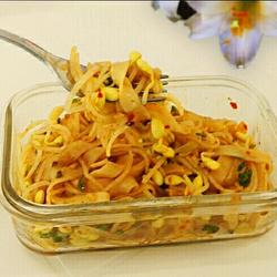 7.Put the drained noodles and bean sprouts into a large bowl, add chopped green onion, and drizzle with spicy sauce