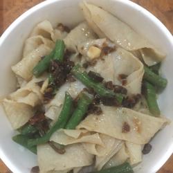 5.Blanch the washed tender beans in boiling water until they turn green, then remove them from the cold water and drain them