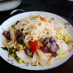 7.Add salt, light soy sauce, and sugar, stir-fry for half a minute, then add the fried beef slices, pepper slices, noodles, and finally pour in rice vinegar and stir-fry Mix evenly and serve