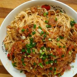 2. Prepare two pots to be turned on at the same time, one pot to stir-fry the sauce and the other Boil water and cook noodles.Add oil in a pot, first stir-fry the minced ginger, then add the minced meat and stir-fry until it changes color, then add the chili sauce and stir-fry until fragrant, add the diced tomatoes, stir-fry until it becomes a tomato sauce, and finally add the shredded onions and stir-fry to form a sauce.