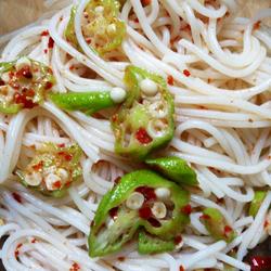 9.Put the fried okra into the bowl with cooked vermicelli and stir good.