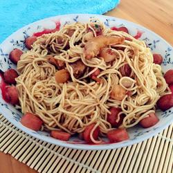 8.Pour the fried ham, scallops and shrimp on top of the noodles, then add the Shacha sauce, mix well and serve on a plate