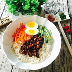 6. Take out the noodles, add carrots, cucumber shreds, sliced hard-boiled eggs, and add two spoons of homemade sauce