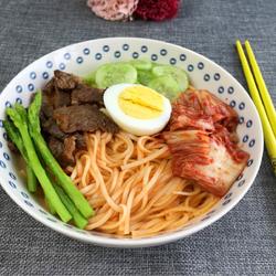 1. Prepare the main ingredients, Korean hot sauce and asparagus! Slice the cucumbers and put them in salt to dehydrate and set aside, and cut the meat into slices and set aside! Boil the eggs, remove the shells and set aside! Slice the kimchi and set aside!