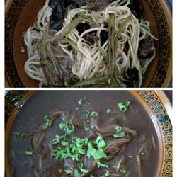 2. Heat the pot and pour in the peanut oil.When it is cooked, take it out and let it cool., (used later when making noodles).Leave a little oil at the bottom of the pot, simmer the onion and ginger, add gourd shreds, stir-fry until cooked, add vinegar, wait until the vinegar boils, pour in water, when it boils, pour in the batter and stir, add fennel powder, pepper powder, soy sauce, salt , take out of the pan and sprinkle with chopped green onion.