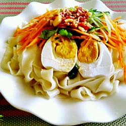 6. Pour the prepared juice into the cold noodles, then add the salted egg and shredded vegetables , coriander, peanuts, sesame hot sauce.