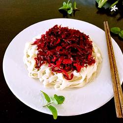 9. Place the noodles on a plate and top with the beets and fried shredded pork , you can eat it.